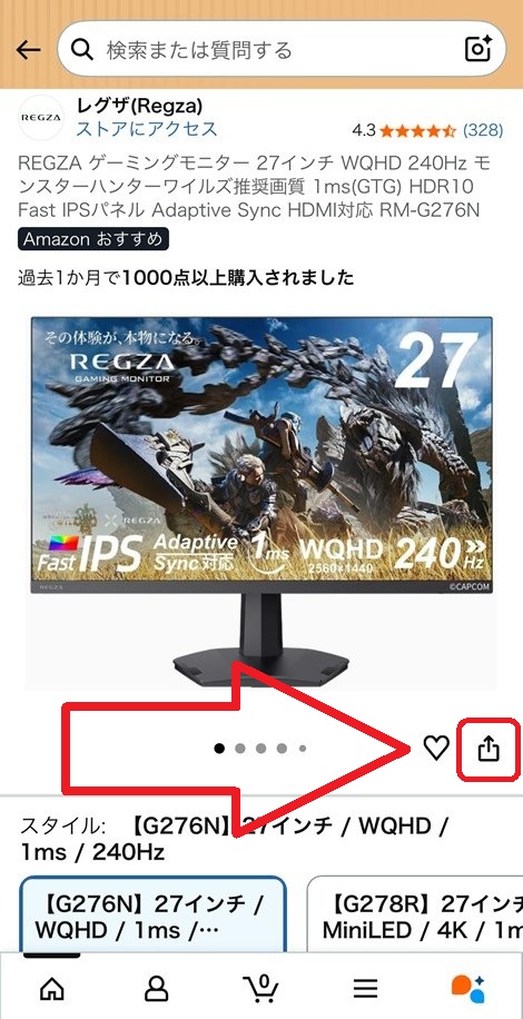 具体的には、商品のメイン画像の下にある「ハートマーク(ほしい物リストに追加)」のすぐ右隣にある「□から↑が飛び出したような矢印マーク」がシェアボタンです。