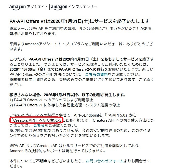 メールで言われている「PA-API Offers v1」の終了は、APIで取得するオファー情報の扱いが変わる話です。テキストリンクや画像リンクなど、通常のアソシエイトリンク自体が直ちに使えなくなる、という内容ではありません。