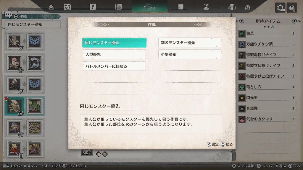 勝手に攻撃してカウンターで倒されるので、作戦で「同じモンスター優先」にしておきましょう。