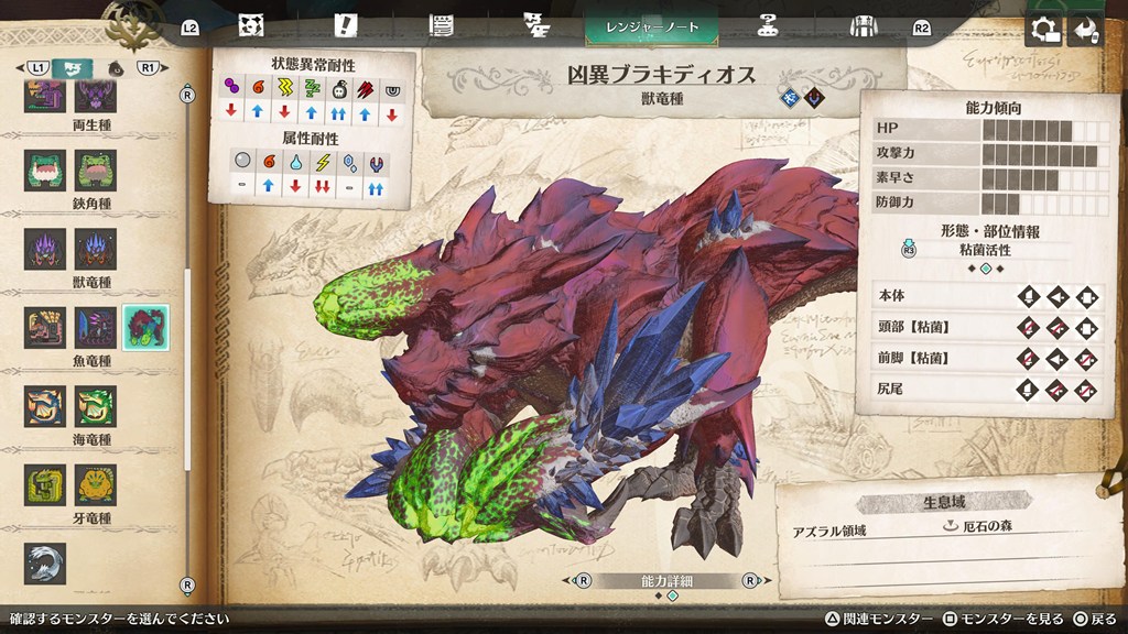 凶異ブラキディオスは、粘菌活性のときスピード(青)、それ以外はパワー(赤)です。