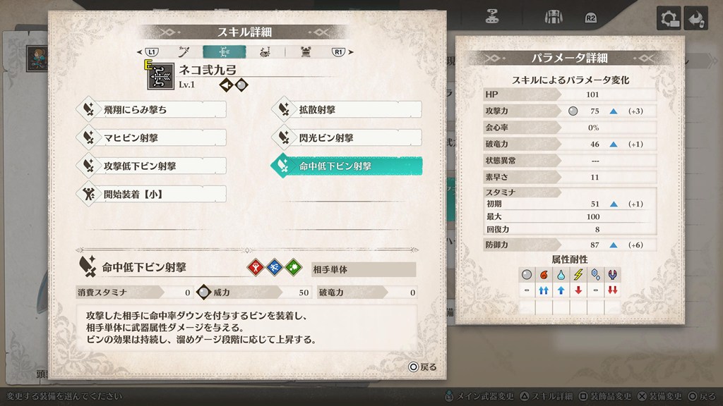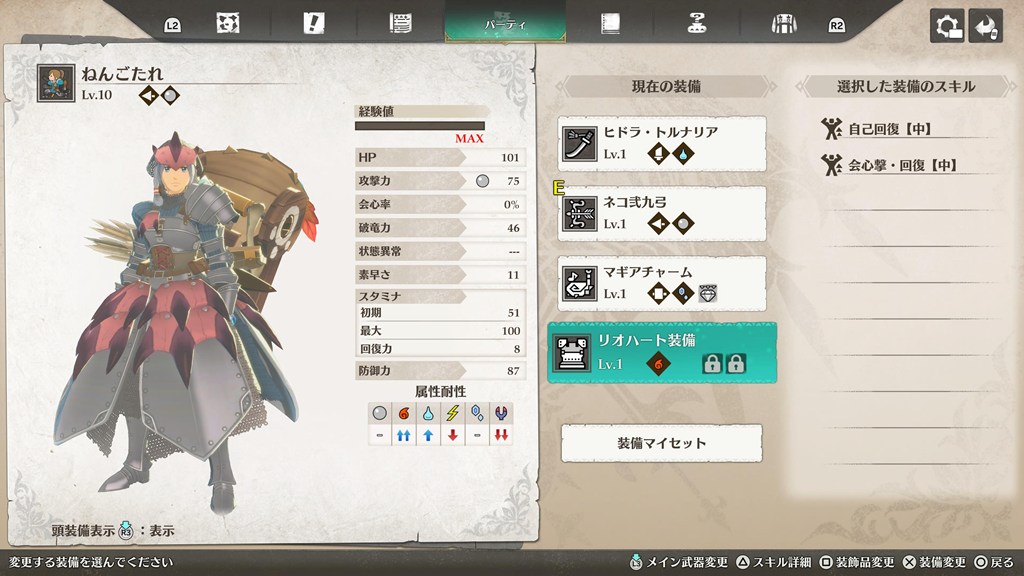 また、ネロミェール装備の方が防御力が高いですが火に弱いので採用しませんでした。防御力は「ネコ弐九弓」で少しアップできるので、そちらでカバーしてます。