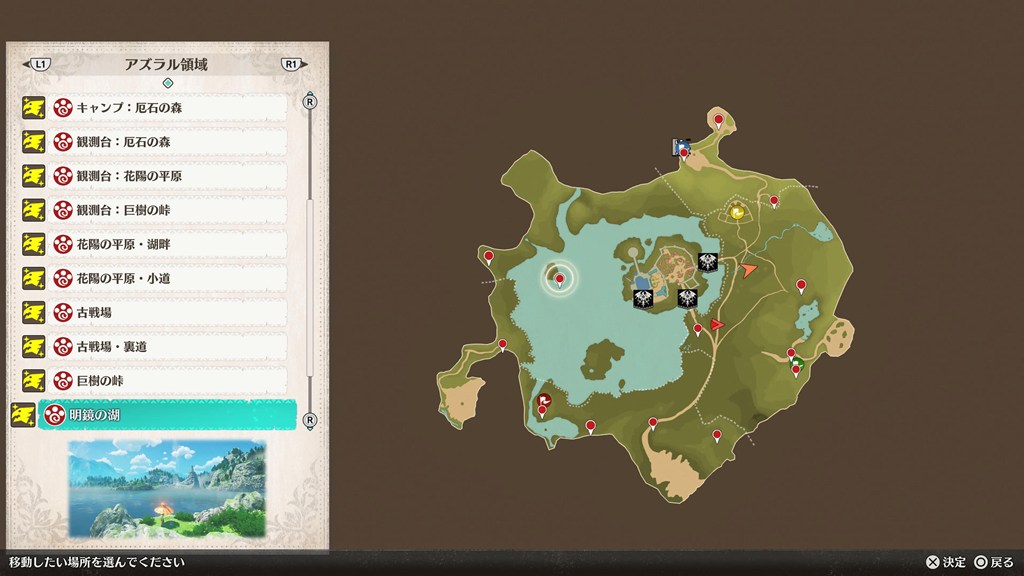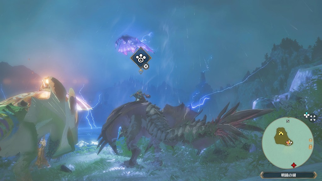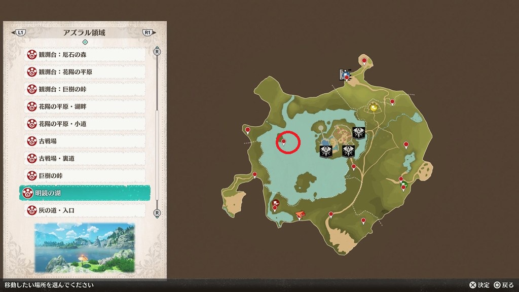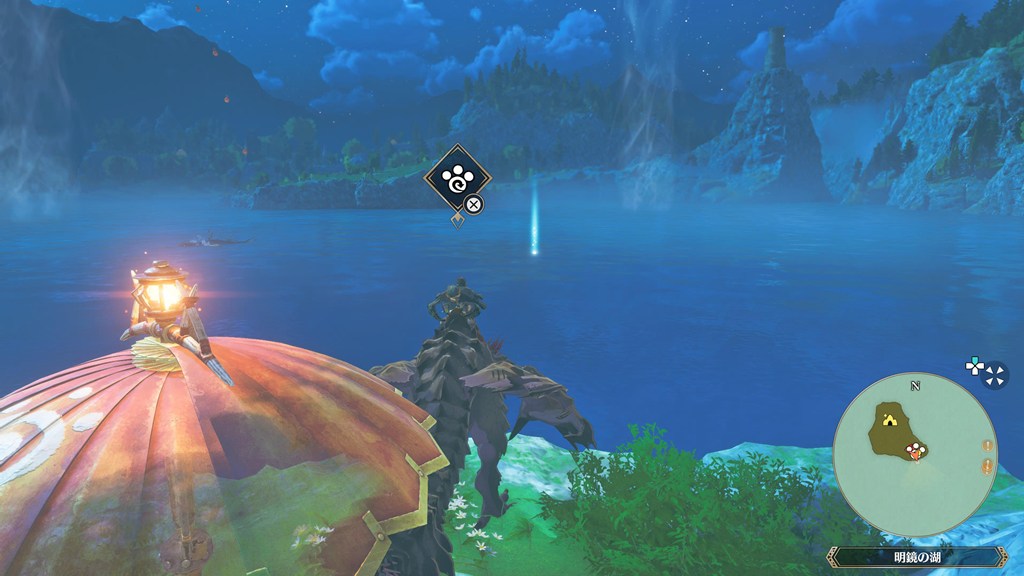 このとき、飛んで行ってもいいのですが、ファストトラベルの夜間で「明鏡の湖」に飛んでもそのまま出現しているので、そこから飛んだほうが早いです。
