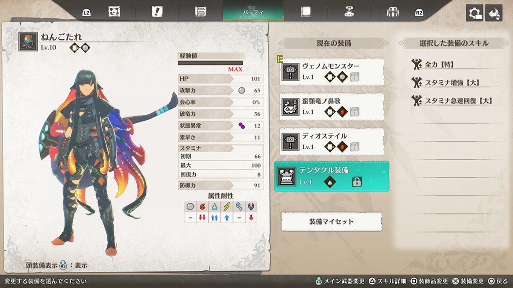 ネロミェールの防具が強く、スタミナ関係のスキルが付いています。