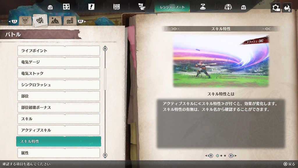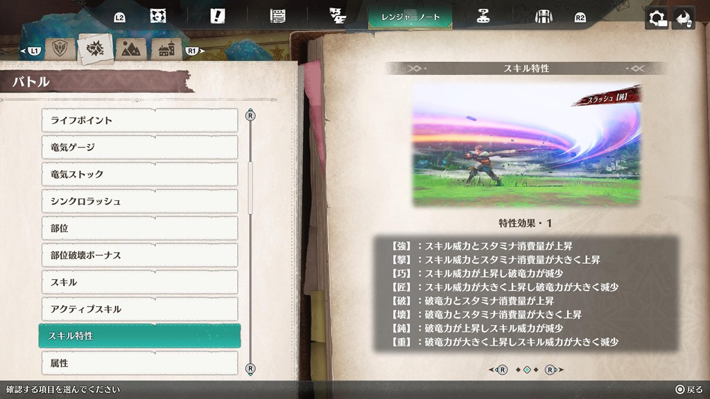 武器スキルの横の漢字は「スキル特性」というもので、効果が変化するようです。