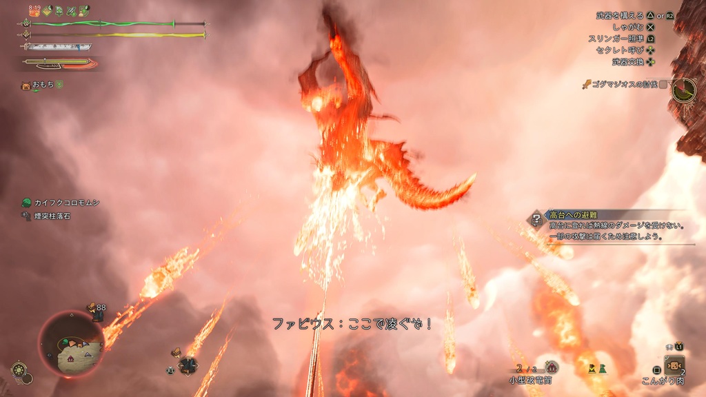 避難場所は、高台(1回だけ使える)、ファビウスさんの後ろ、自分でガードの3パターンあります。(モドリ玉やファストトラベルは使用できなくなってます。)
