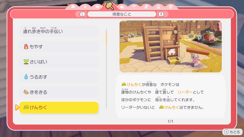 レシピから建物を建てる時、「けんちく」が得意なポケモンが最低1匹は必要になります。