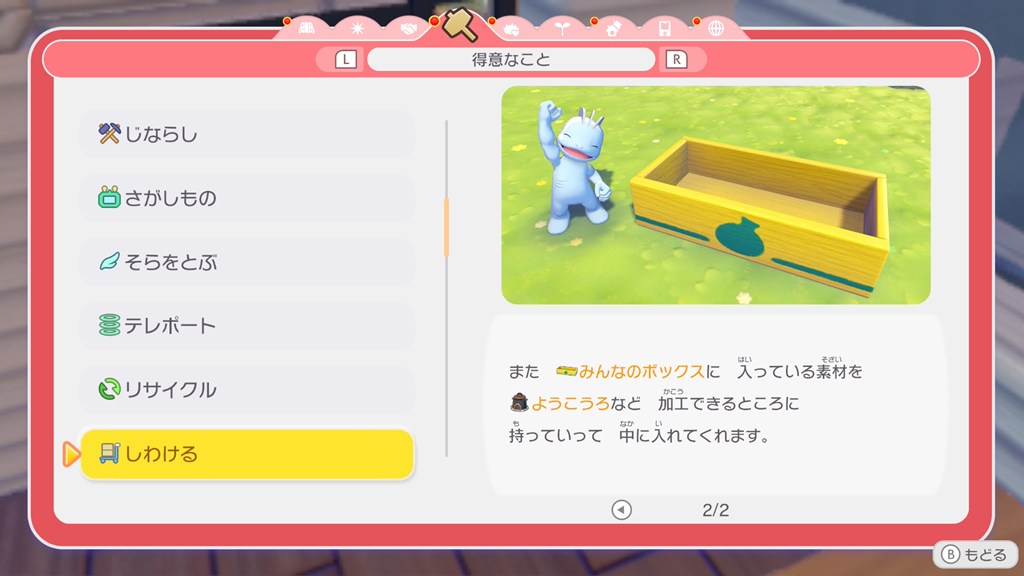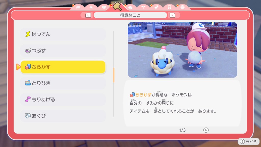 「ちらかす」ことが得意なポケモンがちらかした(生産した)素材を「みんなのボックス」に入れてくれます。