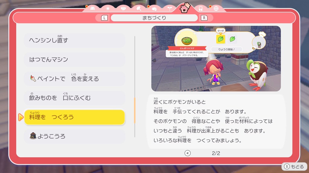 建物の建築や料理といった作業はプレイヤーの仕事ですが、面倒な「素材集め」や「加工」はポケモンの得意なことに任せて自動化できます。