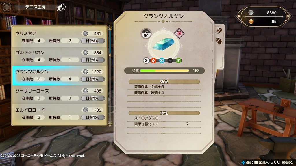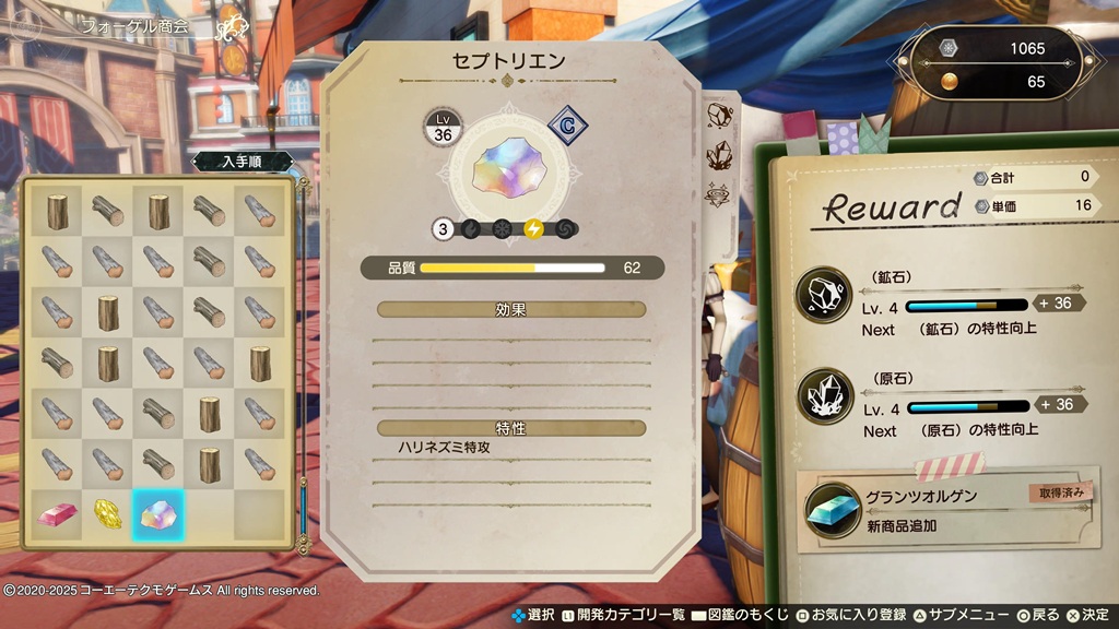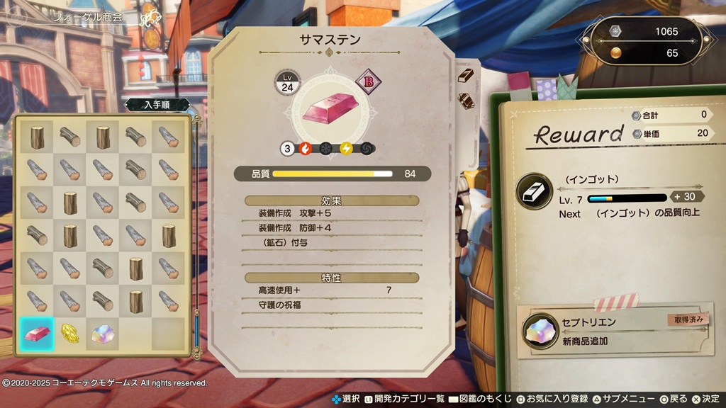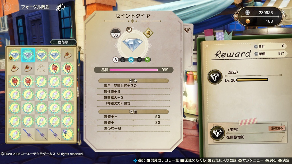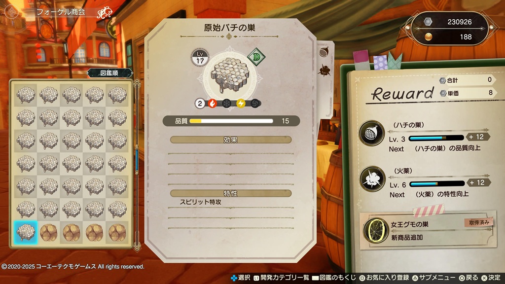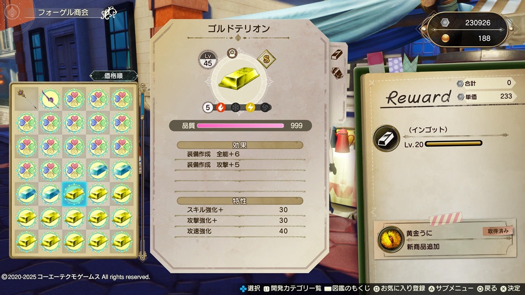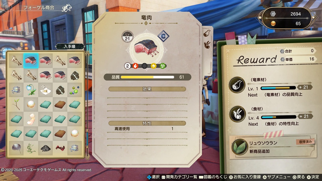 また、ショップ開発は終盤で入手できるような素材でも購入できるようになるので、新しい素材を入手したり、調合したりしたときは、随時確認するようにしておくようにしましょう。