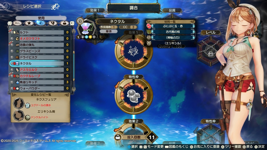 「セプトリエン」は「クリスタルエレメント」を「精霊の小瓶」からレシピ変化するのに必要になります。竜素材がないので、その1つ手前をエッセンスを使って「影響拡大+2」にして作成すると、以後の調合がすごく楽になります。