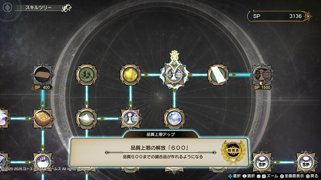 2つ目のエリア「水底の星都」をクリアし、調査も完了してしまえば、「品質上限の解放「600」」「エッセンス」がスキルツリーで解放できるようになります。