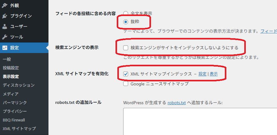 プラグインの設定を行う前に、WordPress本体の「設定 > 表示設定」を開き、以下の3項目が以下の状態に設定されているかを確認します。