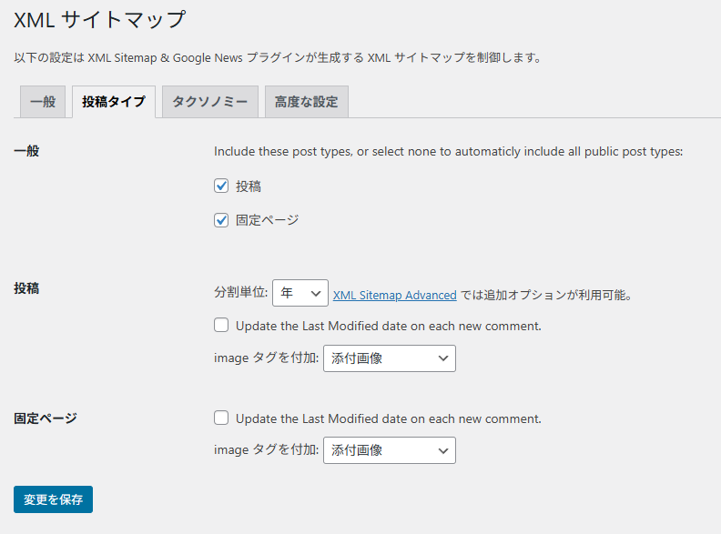 WordPressメニューの「設定 > XMLサイトマップ」を開き、以下の通りに設定します。